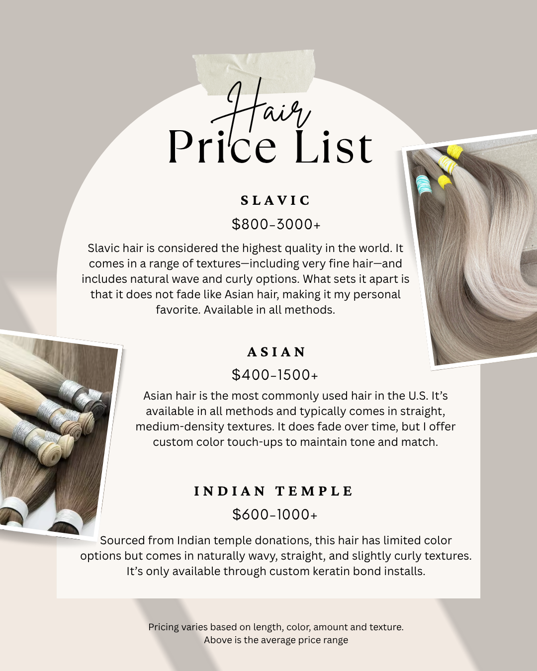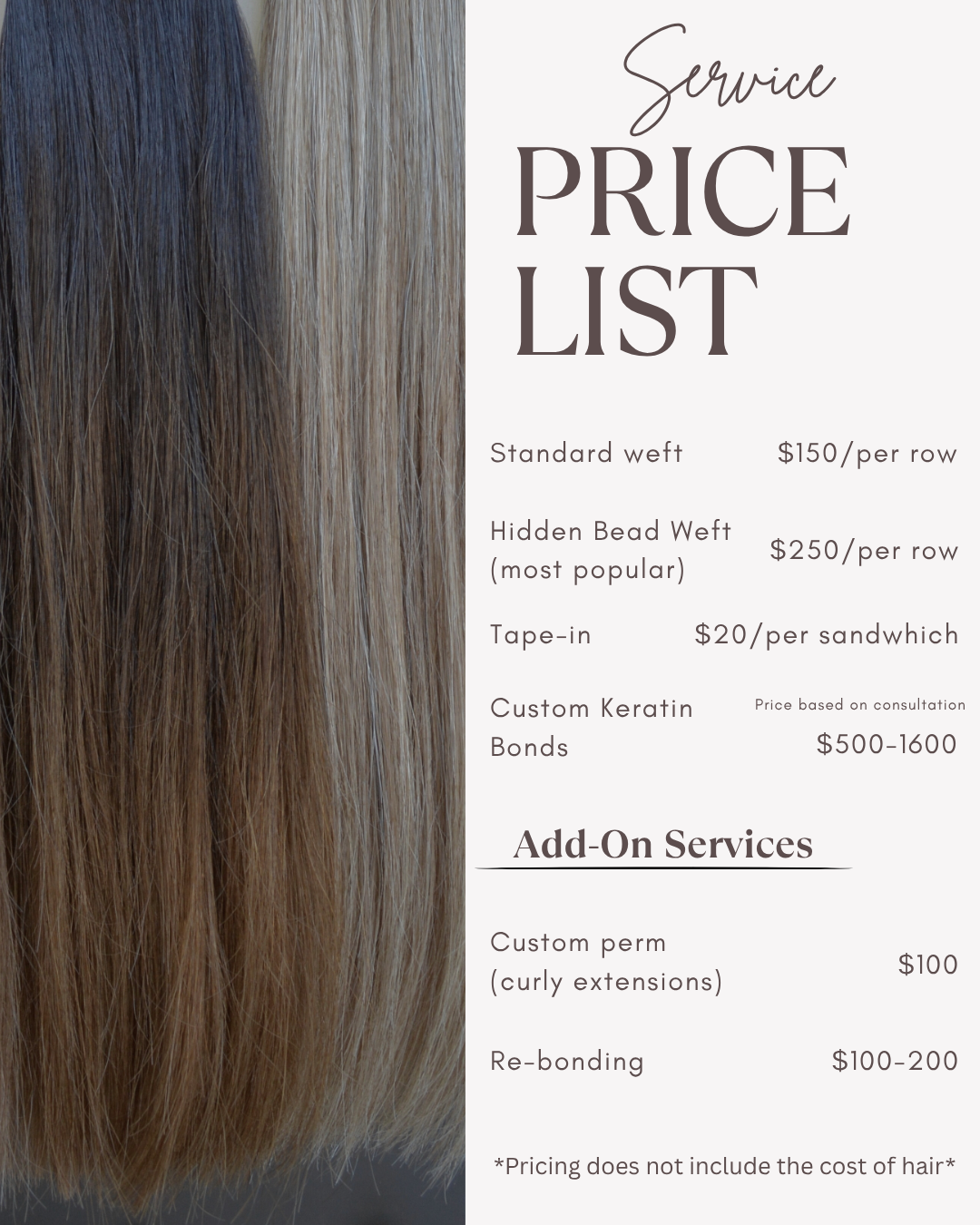 All extension service prices are based on a personalized consultation. I strive to maintain transparent pricing, but since extensions are a nuanced service, it can be challenging to create a one-size-fits-all pricing guide. While it's uncommon for the price to vary, please keep in mind that individual needs and preferences can result in adjustments. I encourage you to book a consultation for the most accurate pricing tailored to your specific requirements. Thank you for your understanding!
